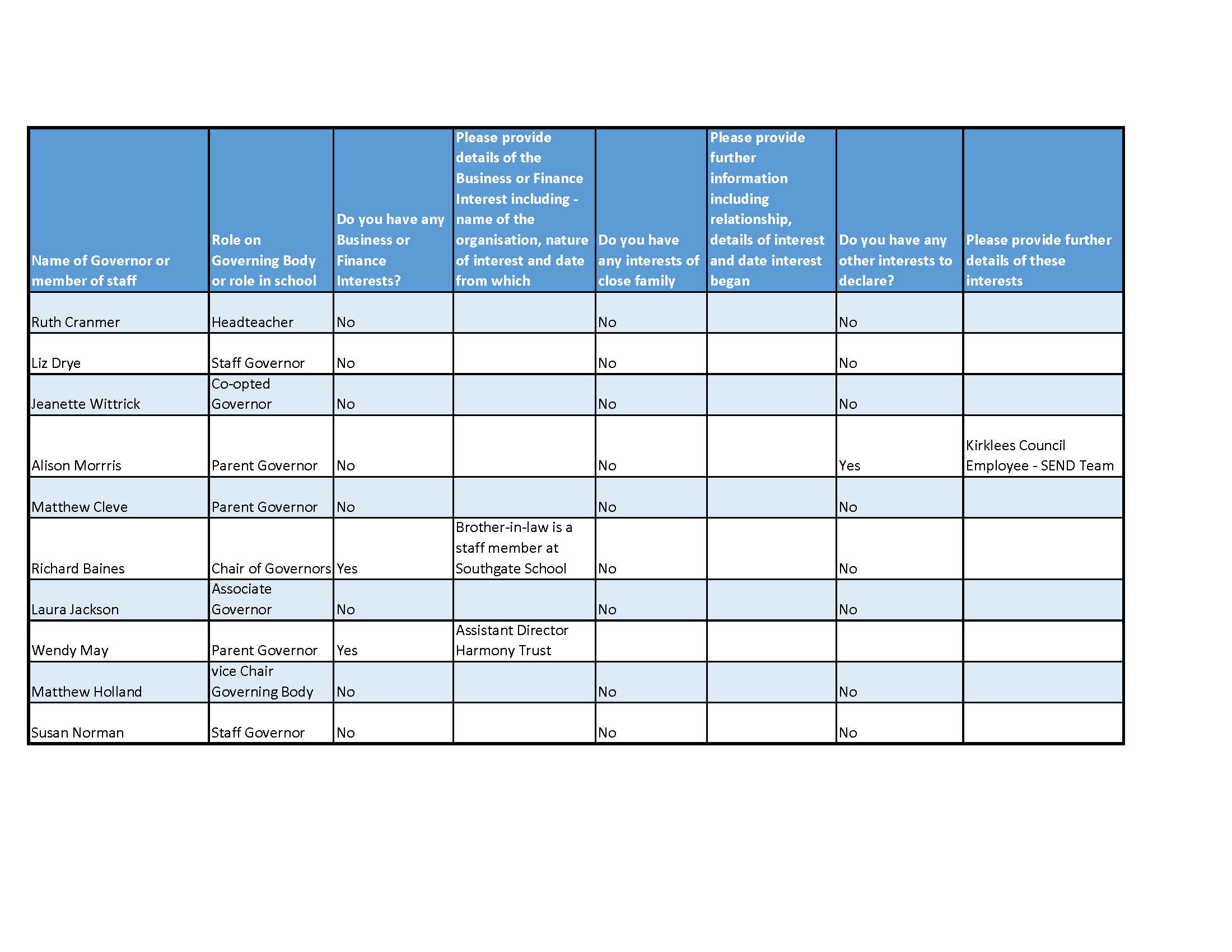 The register sets out the relevant business interest of Governors and any relationships between members of the Governing Body and members of the school staff including spouses, partners and other relatives.